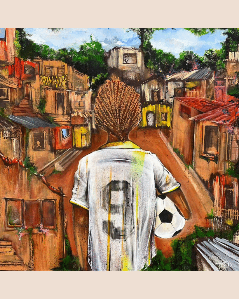 A obra celebra o sonho periférico de ser goleador não só no futebol, mas na vida.